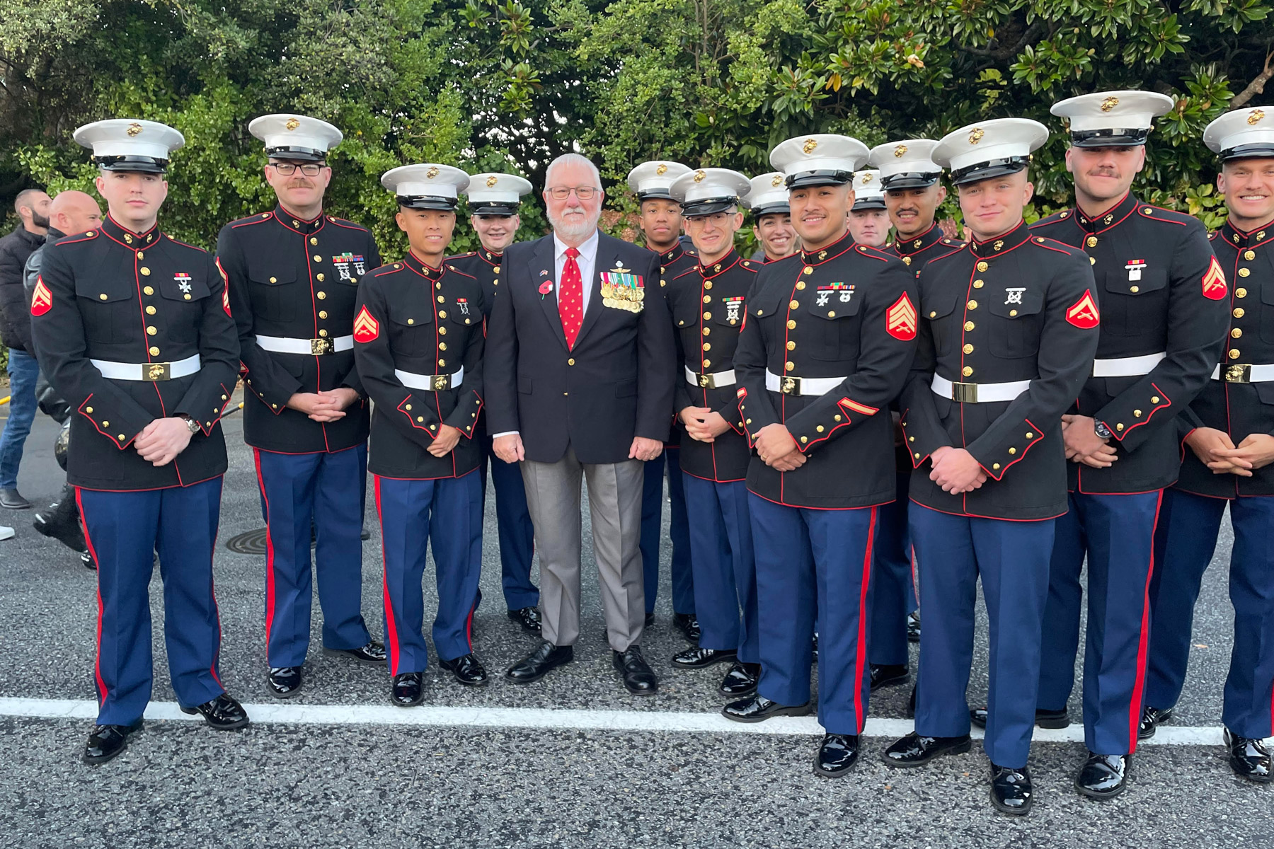 Pictured here are members of the band with Major Larry Keim from the Kapiti U.S.Marines Trust.