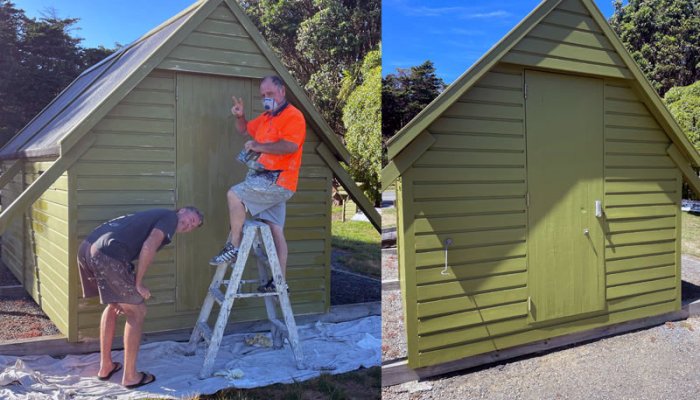 The hut has been refreshed in Resene’s colour “Planter”...