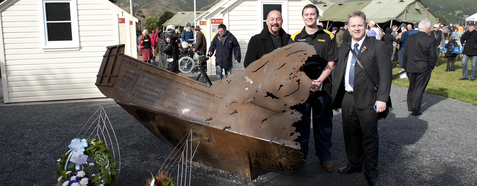 Seventy years later, (May 28 2012), conditions were identical when three shipmates from USS American Legion came to Paekākāriki to attend the Salute 70 celebrations. Sadly, all men are now deceased. Ray Plante was on the ship itself, Ted Picard was coxswain (driver) of an LCVP loaded with Marines in combat gear, while Frank Zalot was in the beach party of 25 sailors whose task was to manage the flotilla after landing their human cargo.